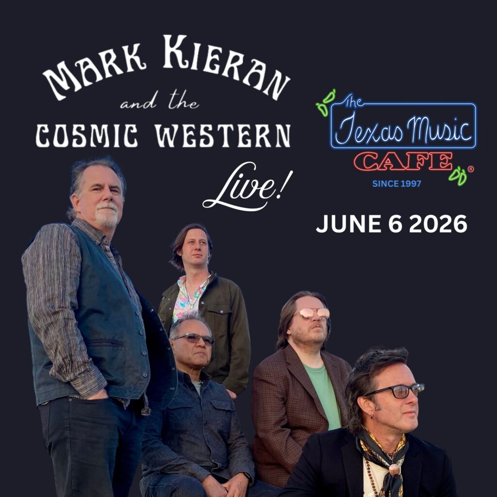 Mark Kieran & Cosmic Western bring storytelling, steel strings, and Texas skies together for an intimate night at Texas Music Cafe. Emerging from the sun-bleached spaces of the American Southwest, Mark Kieran and the Cosmic Western are carving a distinct space in the modern indie-rock and alt-country scene. Their sound is a cinematic blend of desert atmosphere and mountain air—equal parts restless energy and soulful warmth.
