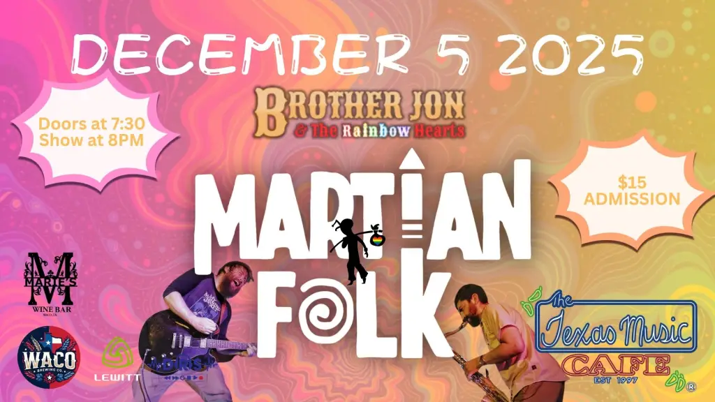 Join us for an electrifying night of Central Texas music as Martian Folk and Brother Jon & The Rainbow Hearts take the stage at the Texas Music Cafe! Expect honest, heartfelt music featuring smooth vocals, expert guitar work, and a tight rhythm section perfect for a night of pure, roots-driven energy.
